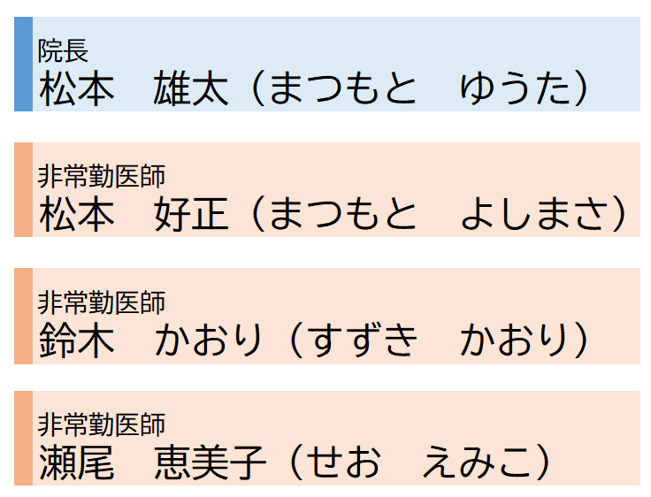 受付 8:20-12:00 | 鈴木 かおり | 瀬尾 恵美子 | 鈴木 かおり | 松本 雄太 (第1週) 鈴木 かおり (第2木曜日レディースデイ) | 松本 雄太 | 鈴木 かおり (第1・3週) 瀬尾 恵美子 (第2週) 松本 好正 (第4・5週) |