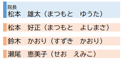 受付 8:20-12:00 | 鈴木 かおり | 瀬尾 恵美子 | 鈴木 かおり | 松本 雄太 (第1週) 鈴木 かおり (第3木曜日レディースデイ) | 松本 雄太 | 鈴木 かおり (第1・3週) 瀬尾 恵美子 (第2週) 松本 好正 (第4・5週) |
