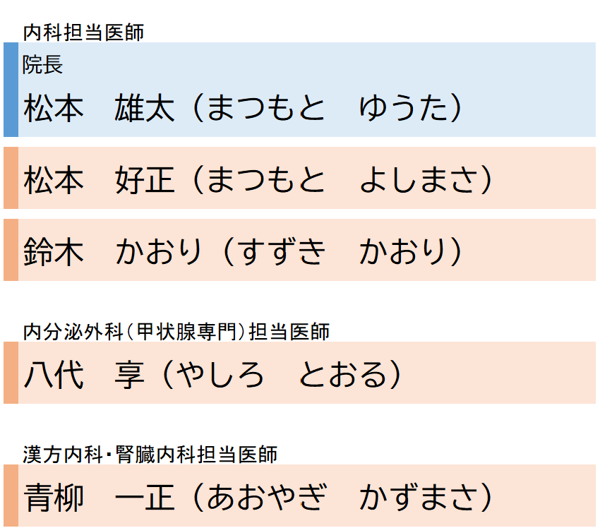 松本 雄太 | 鈴木 かおり アレルギー科非対応 | 松本 雄太 | ー | 松本 好正 | 松本 雄太 受付開始 9:15~12:00 |